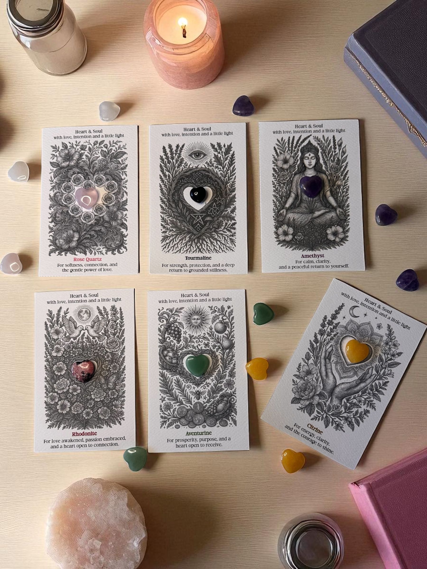 - Crystal-infused candles, hand-poured in small batches using sustainably sourced coconut and soy wax, pure essential oils, and moon-cleansed crystals. Each one comes with affirmations and gentle guidance to support your rituals.